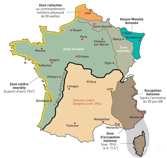 Carte : la France découpée en zones et la ligne de démarcation.