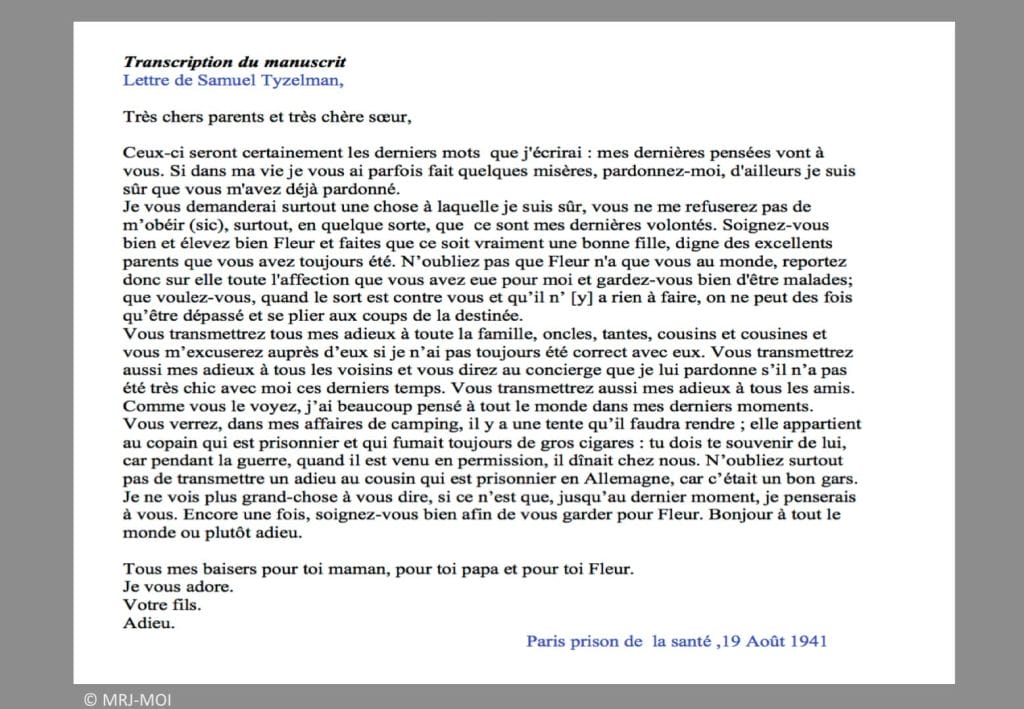Transcription de la dernière lettre de Samuel (Szmul) Tyszelman.