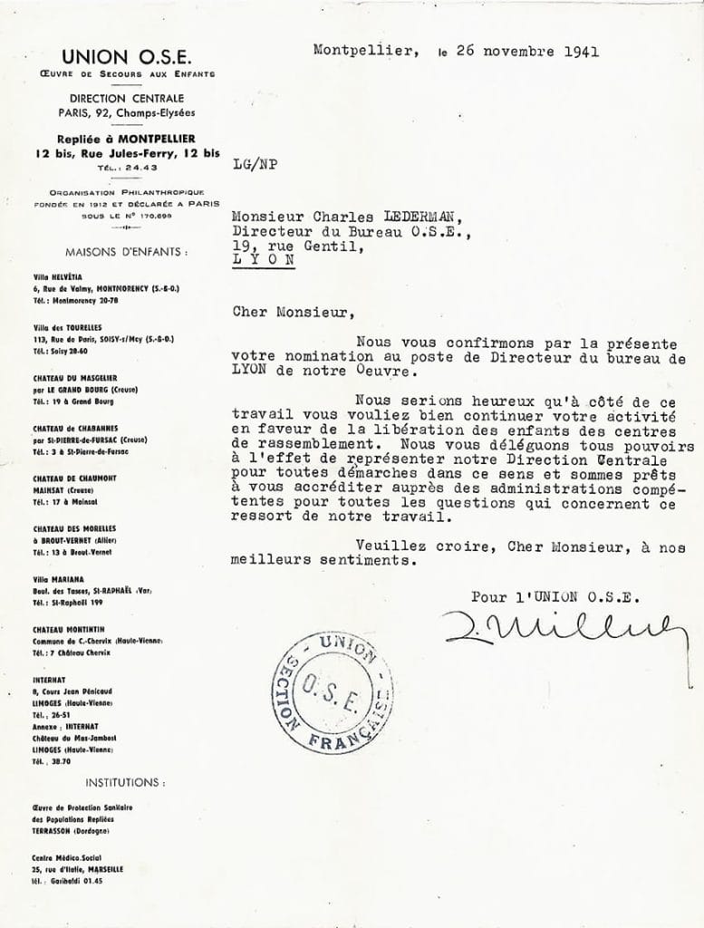 Lettre de l’OSE du 26 novembre 1941 certifiant la nomination de Charles Lederman comme Directeur du bureau de Lyon avec mission de travailler à la libération des enfants.