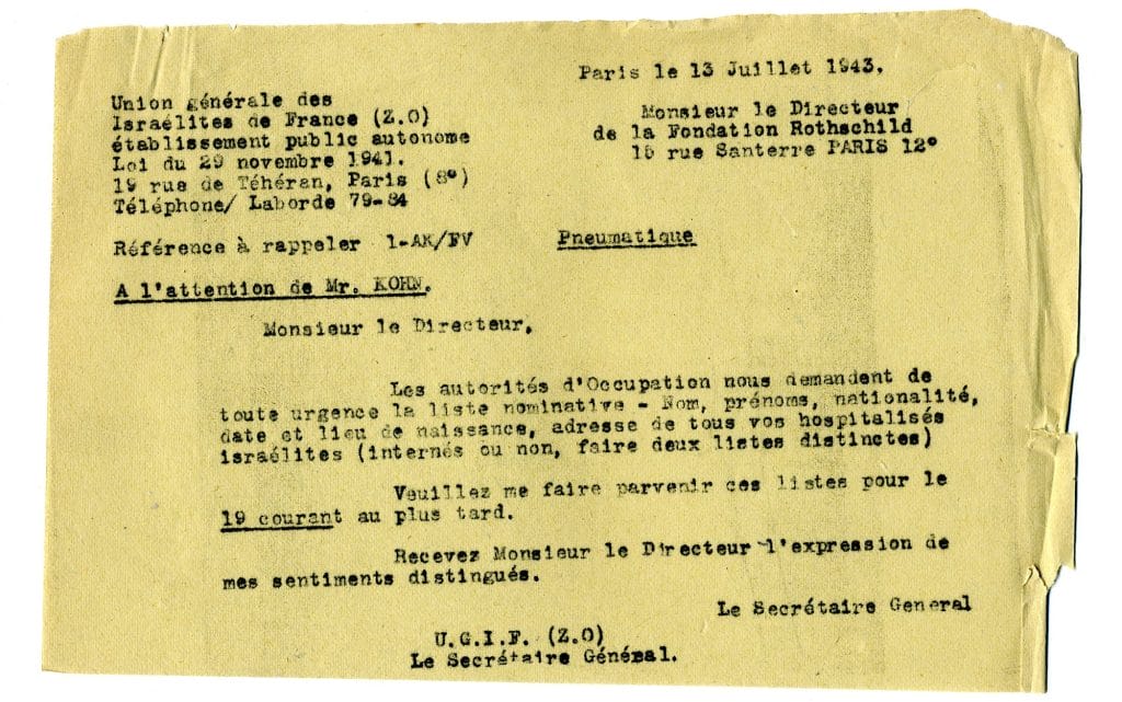 Pneumatique du 13 juillet 1943 de l’UGIF à la Fondation Rothschild, demandant la liste de tous les hospitalisés juifs pour transmission aux Allemands.