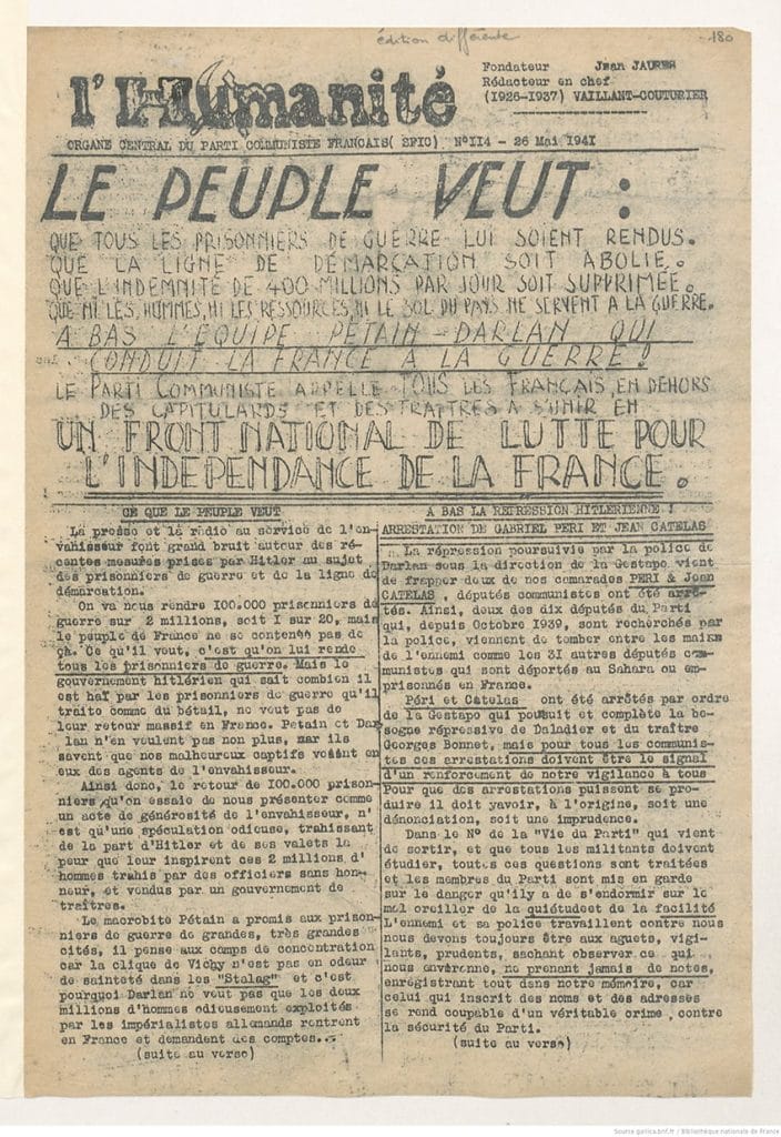 , périodique communiste clandestin, dénonce les partisans de l’Allemagne qualifiés de traîtres (février-mars 1941).