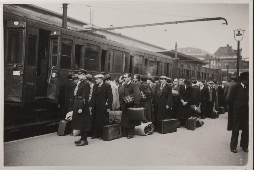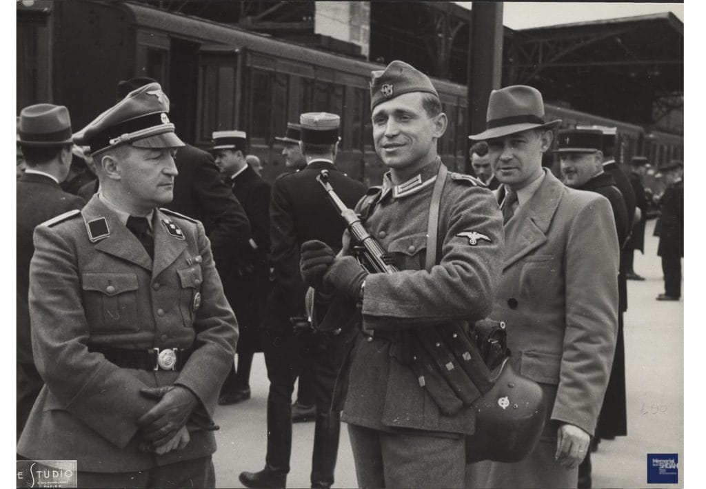 La rafle des Juifs étrangers parisiens 14 mai 1941 : embarquement en gare d’Austerlitz pour les camps du Loiret sous la garde de gendarmes français et de soldats allemands.