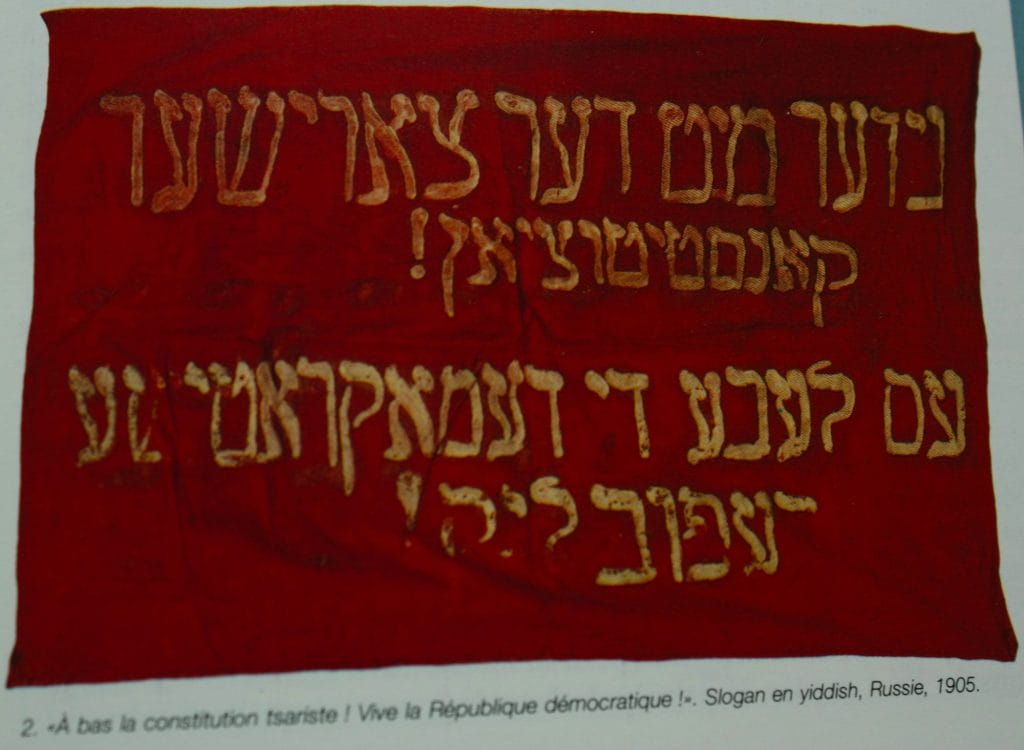 Bannière du Bund (créé en 1897 à Vilna en Lituanie sous domination russe) pendant la Révolution de 1905. En yiddish : « À bas la constitution tsariste ! Vive la République démocratique ».