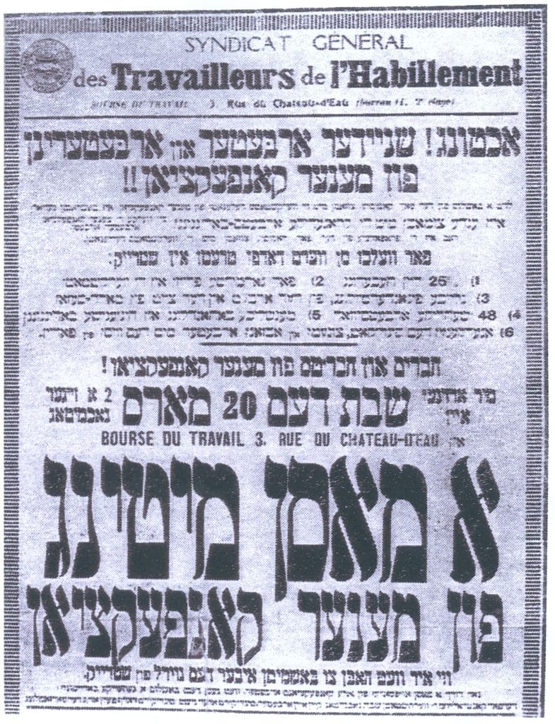 Affiche en yiddish du Syndicat général des Travailleurs de l’Habillement : « Attention ! Travailleurs et Travailleuses de l’habillement dans la confection pour hommes ! Pour atteindre notre but, il faut se mettre en grève (…)