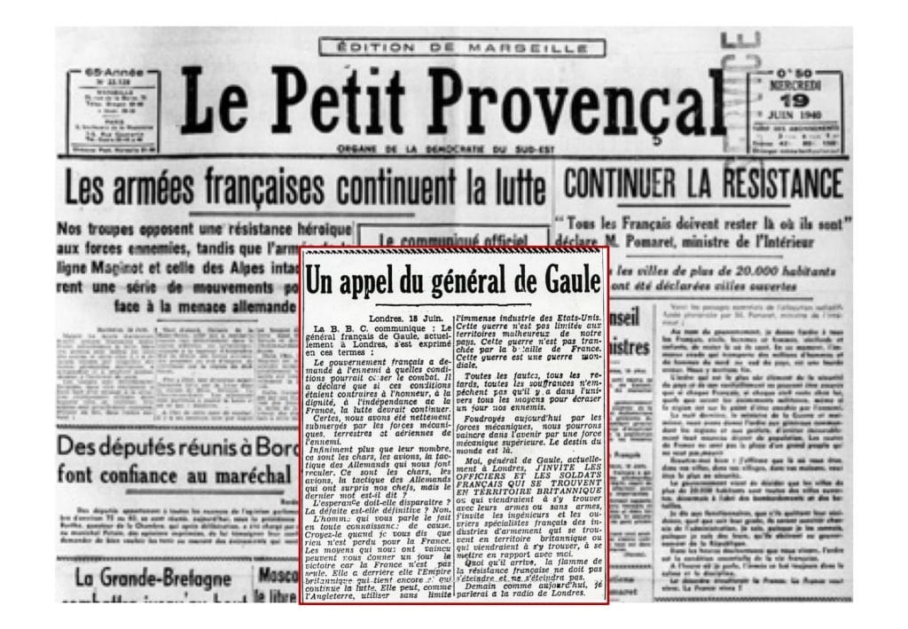 dans son édition du 19 juin 1940 reproduit l’allocution du général de Gaulle (de Gaule!) prononcée le 18 juin à Londres.
