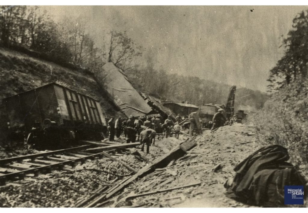 F.T.P.F. examinant un train venant de dérailler à la suite d’un sabotage, au lieu-dit La Porcherie (Haute-Vienne), 1943-1944.
