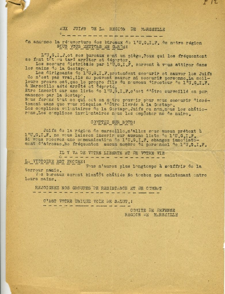 Tract du Comité de Défense de la région de Marseille mettant en garde les Juifs contre les agissements de l’UGIF.