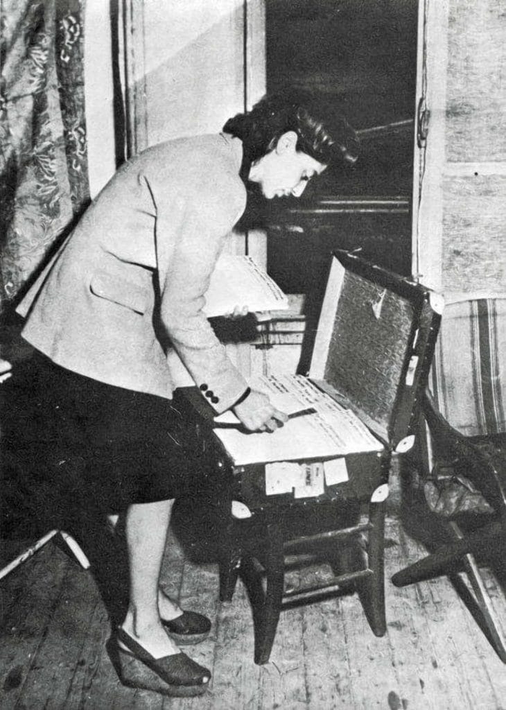 Résistante, agent de liaison, préparant un transport de tracts (reconstitution à la Libération).