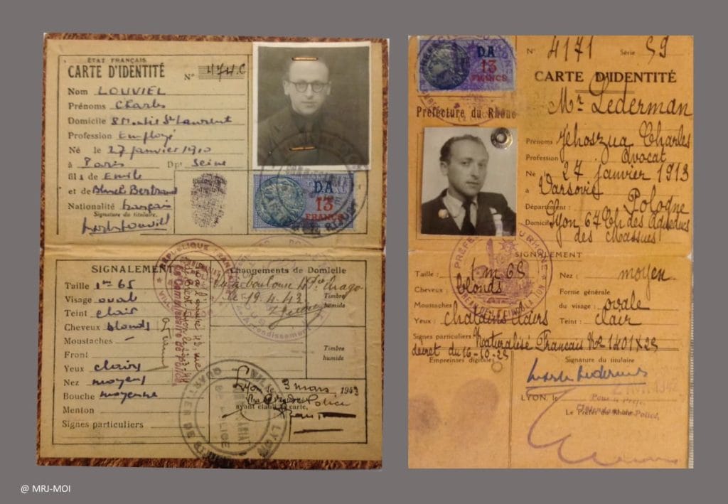 Vraie carte d’identité de Charles Lederman établie à Lyon le 2 avril 1942, et sa fausse carte au nom de Louviel (3 mars 1943).