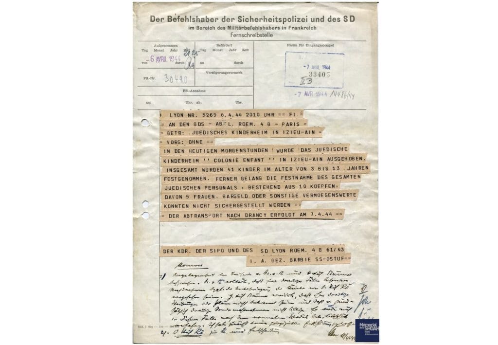 Télégramme du 6 avril 1944 de Klaus Barbie de la Gestapo de Lyon, concernant l’arrestation du personnel et des enfants de la Colonie d’enfants d’Izieu et leur transfert à Drancy.