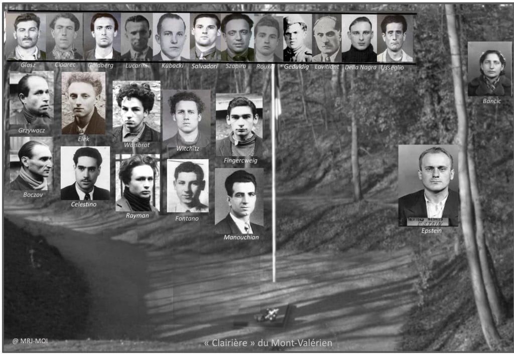 Exécutions au Mont-Valérien de 22 membres du « groupe Manouchian », le 21 fév. 1944 (Olga Bancic décapitée en Allemagne) et de Joseph Epstein responsable des FTPF de la région parisienne, le 11 avr. 1944.