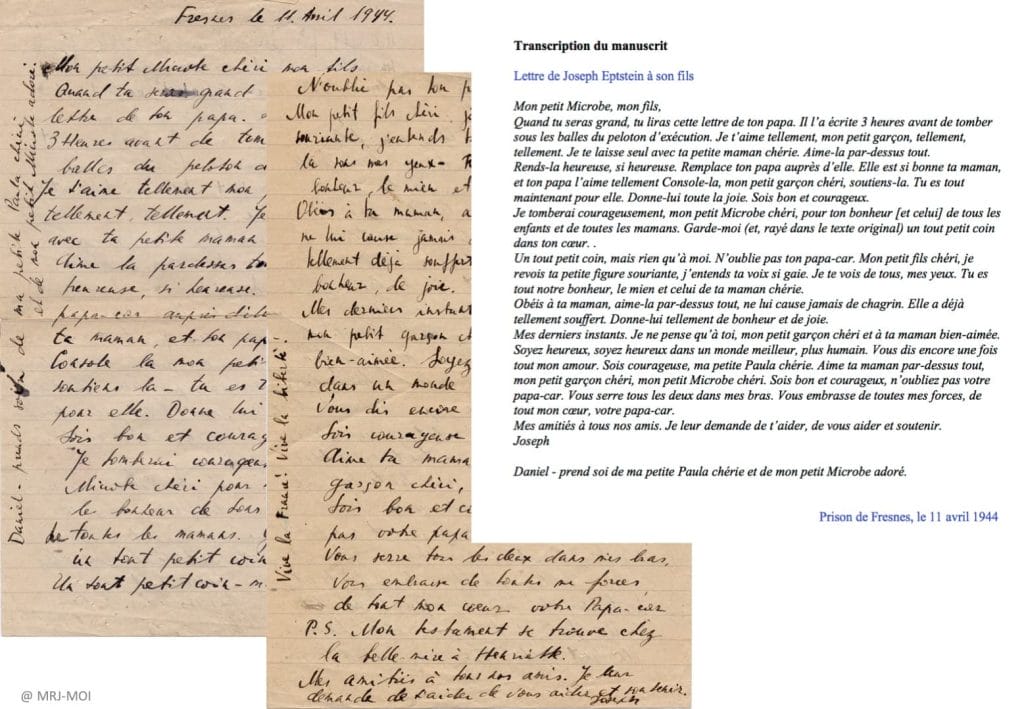 Lettre de Joseph Epstein à son fils, depuis la prison de Fresnes, le 11 avril 1944, jour de son exécution par les Allemands au Mont-Valérien.