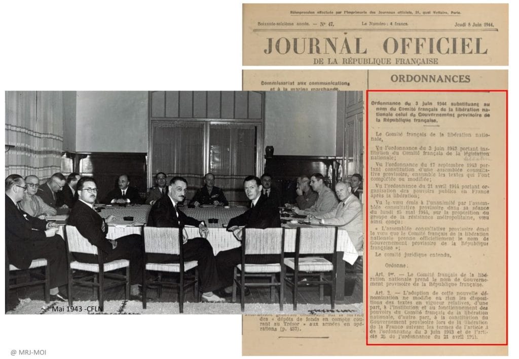 Le 3 juin 1944, à Alger, le Comité français de la libération nationale devient le Gouvernement provisoire de la République française (JO du 8 juin 1944).