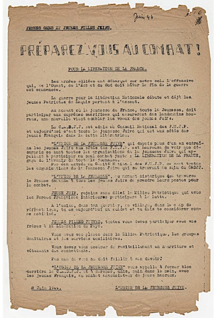 Tract de l’UJJ appelant la jeunesse juive, au lendemain du débarquement de Normandie, à rejoindre les Milices patriotiques.