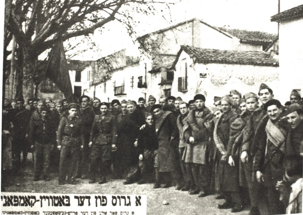 Combattants juifs en Espagne de la Brigade Botwin à Casas Ibáñez près d’Albacete (décembre 1937). Texte : « Le salut de la Compagnie Botwin ».