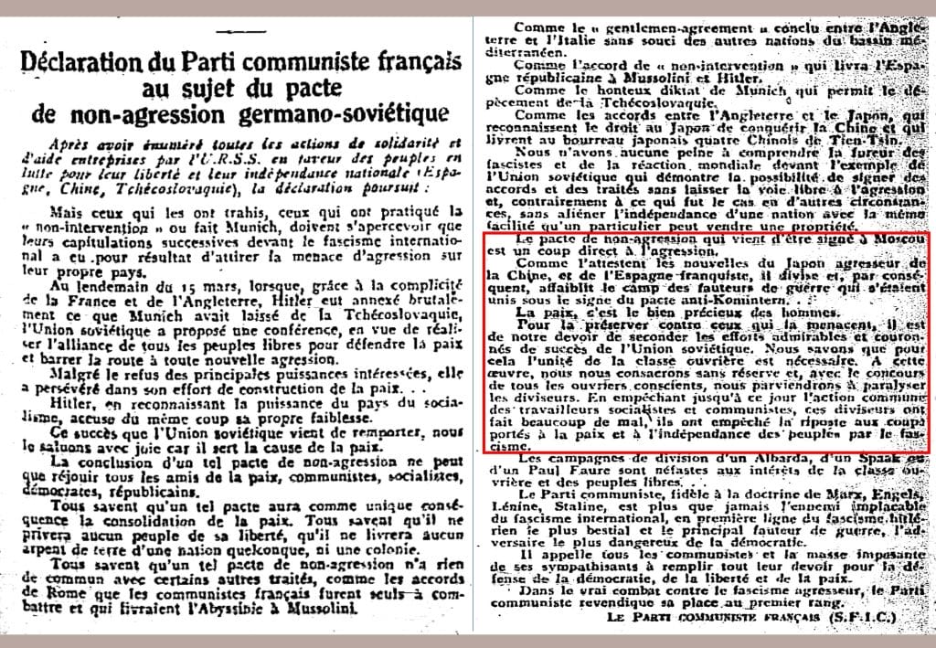 Déclaration du Parti communiste français le 26 août à la suite de la signature du Pacte de non-agression germano-soviétique.