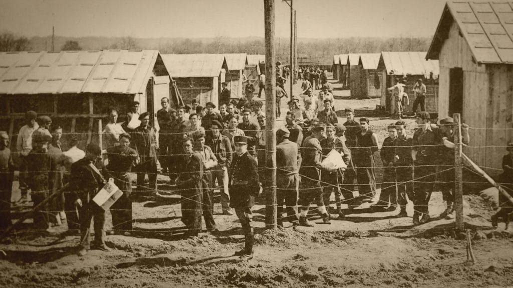 Internés au camp de Gurs sous la garde de gendarmes français : parmi eux, des brigadistes et des républicains espagnols.