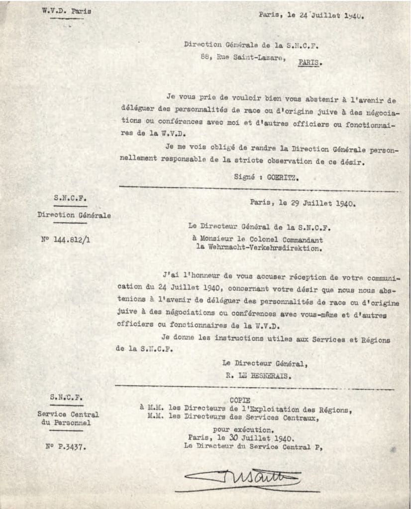 La S.N.C.F, le 29 juillet 1940 anticipe la loi du 3 oct.1940, portant « statut des juifs ». Échange de courriers entre la direction de la SNCF et la « Direction des transports de l’armée allemande ».