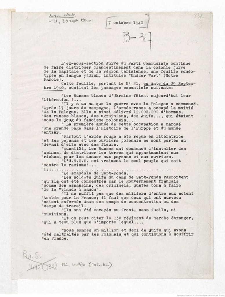 , du 29 sept. 1940, journal clandestin en yiddish, de la section juive de la M.O.I.
