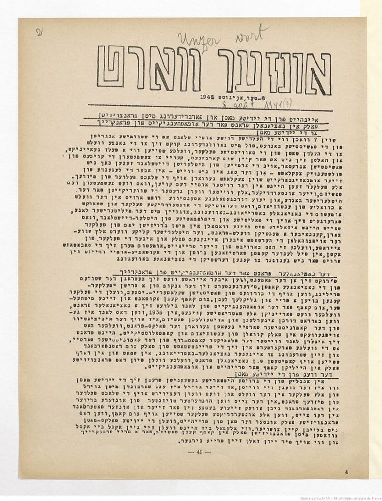 , du 8 août 1941, appelant à « Unité des masses juives et fraternité avec le peuple français dans le Front national pour l’indépendance de la France ».